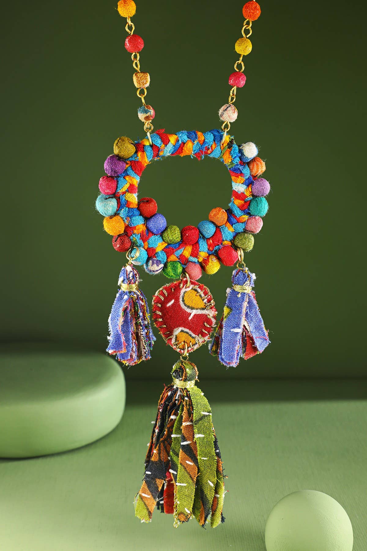 A gold metallic horseshoe-shaped pendant with Kantha fringe hangs from a strand of colorful repurposed Kantha beads. Give a ethical & sustainable gift this holiday season! This necklace makes the perfect gift for Christmas 2025 or stocking stuffers. • Measures 21" with a 2" extender. • Sustainably handmade from repurposed cotton Sari & Kantha textiles by women artisans in India. • Colors & patterns will vary due to repurposed textiles.