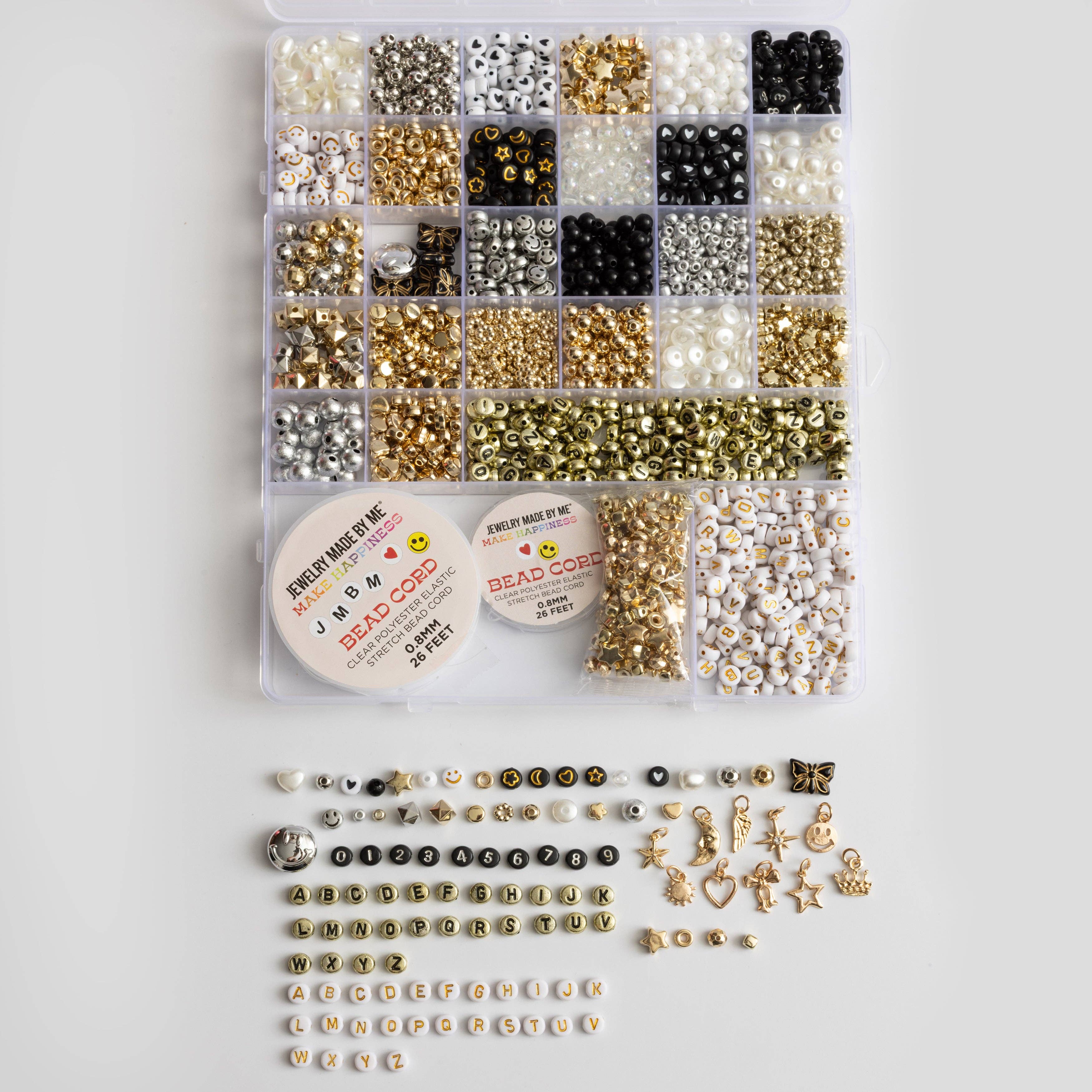 Say it with style. This all-in-one bead box is stacked with over 1,000 classic black-and-white cube letter beads—every letter, every number, for lots of personalization. Includes stretch cord so you're ready to make friendship bracelets, coded messages, viral phrases, or your next iconic stack straight out of the box. It’s minimal, graphic, and majorly expressive.