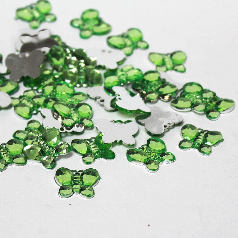 A mixture of green and purple dew drops. Flat on one side, three-dimensional on the opposite side.