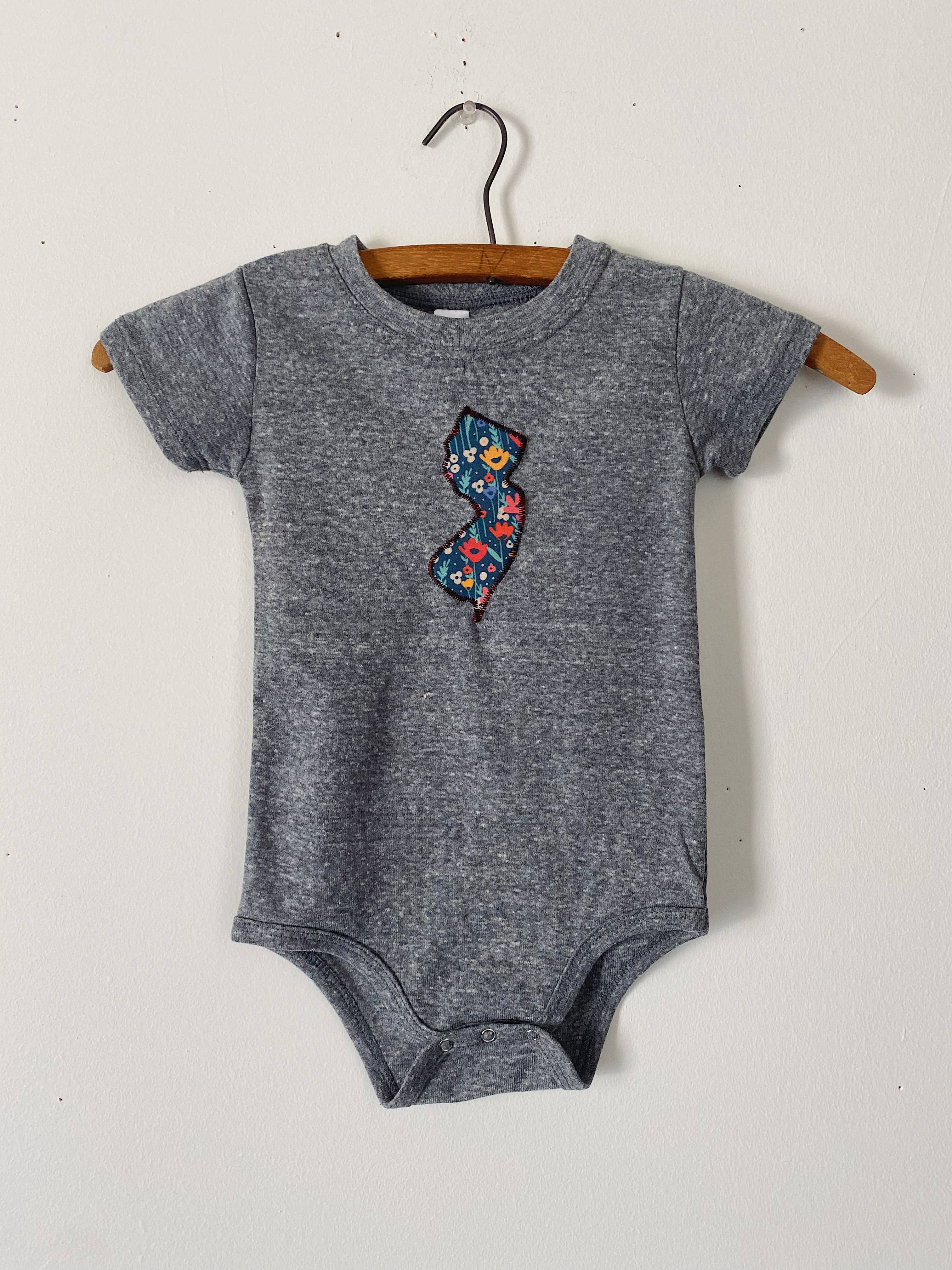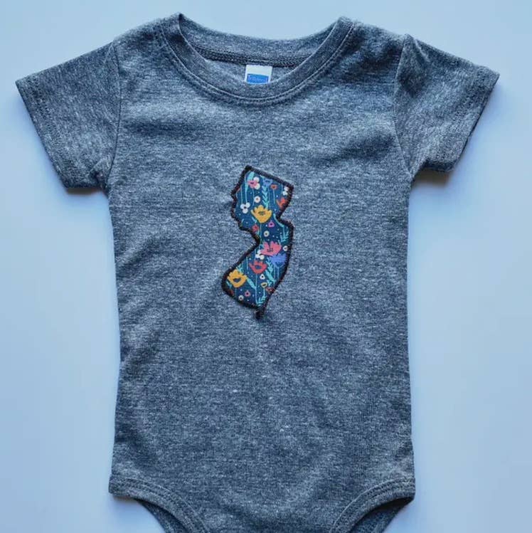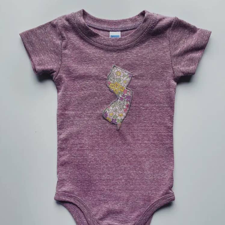 NEW: you now have the option of choosing a BIG New Jersey or a standard size NJ ("standard" size = same size New Jersey that has always appeared on my onesies. "BIG" size = the same size New Jersey that appears on all of my t-shirts). Please bear with me as I work quickly to post better, more appealing product images to this listing. Inspired by the delicate nature of summer wedding season, these fresh suits are for babies who wanna get pretty. Each American made onesie comes in a heathered purple, vintage style cotton blend and features your choice of fabric in the following patterns: floral & bird or purple & yellow floral.
