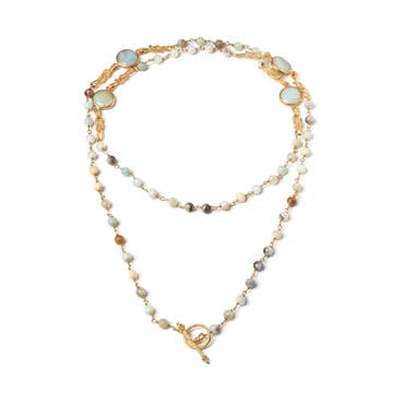 The Talitha Multiway Necklace is composed of silver leaf jasper, gold brushed accent beads and finished with a milky agate pendant. This gorgeous Multiway necklace can be worn long, or wrapped for a unique and fun style. This necklace is strung on extra durable, nylon coated stainless steel wire and measures out to be 42" in length.