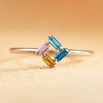 925 sterling silver-gold plated circle ring that sparkles with rainbow-colored stones. Pretty, fun, and dainty. Timeless with a modern feel. Size 7.