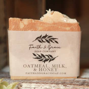 Wanting to find a gentle soap, so gentle that even a baby will love it? Well, here it is. Made with oats, and lots of locally harvested honey that we purchase from an Amish community nearby, it is scented with soothing, tranquil essential oils. We don't grind the oats and chamomile flowers into a superfine powder, but rather we leave some small pieces that will serve to exfoliate. The bars are 4+ oz, and they measure 3.5x2.75x.8 in. Long lasting and mild. ingredients: Olive oil, coconut oil, organic sustainable palm oil, water, lye, honey, oats, cfhamomile flowers, essential oils Custom labels We only print in black ink, so the logo has to be simple, in black, on a white background. You may email me your jpg at orders@stoney-river.com The labels are required to carry either your address or the manufacturer's (us). *We reserve the right to decline designing and printing labels with logos or messages that go against our faith and values, such as anything with witchcraft, sexual, etc