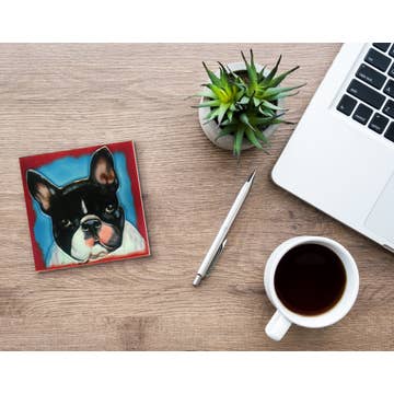 Dog at Fence tile is crafted from porcelain and hand dipped in Rick's specially formulated glaze. All of our tiles are handmade in our Michigan studio. Sculpted by Tonya. There is a notch on back for hanging, yet if you wish to install, it's also suitable for that too. If used outdoors in freezing temperatures, just make sure to keep it vertical. 4x4” is a nominal size. The actual measurements are 3.75 x 3.75" with raised relief of .5" or less. Tile stand sold separately. How’s it made? Sculpt the original design, make plaster mold, press in clay, wait to dry, fire in kiln, glaze, fire again to about 2230 degrees. Cool. Ship to your doorstep. Yay!