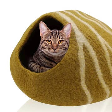 Small and large cats feel comfortable and safe in the cave, which is handmade from pure virgin wool. Thanks to the natural wool fat, the sustainable material is easy to clean, hygienic and antibacterial. Wool felt has antistatic properties and regulates temperature. The felt cave is warm and cozy in winter and pleasantly cool in summer. An eye-catcher for your home. Each cat cave is manufactured to manufacturing quality. The firmly felted material thus offers dimensional stability at the highest level. This ensures years of enjoyment — for the cat and the observer.