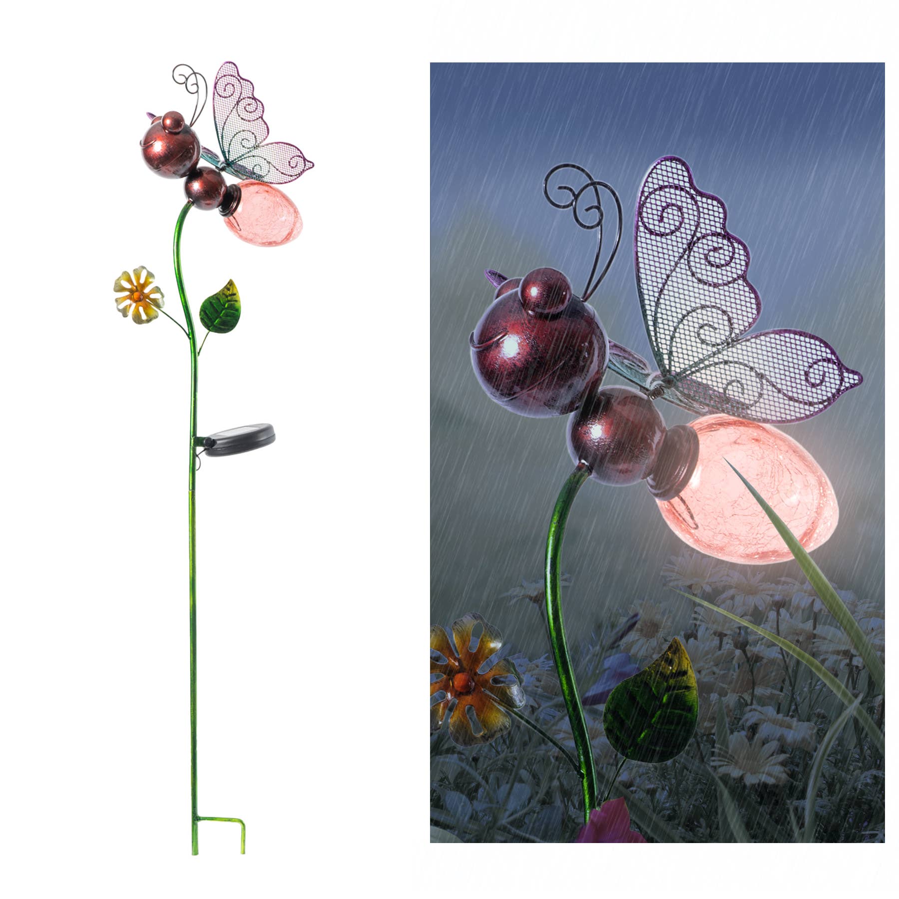 This Butterfly Jar Solar Powered LED Pathway Light Pack can stake anywhere outside that gets direct sunlight, the solar panel collects sunlight to charge the battery during the day automatically turns on at dusk for up to 8 hours of nighttime illumination. Comes in yellow, red and blue. Features * Pre-installed solar-powered battery * Requires no wiring, place anywhere outside that gets direct sunlight * We offer a 1-year limited warranty, with customer support teams ready to help, so you can purchase with confidence! Product Details * Dusk to Dawn: Yes * Number of Lights: 3  Dimension 14.6'' H x 3.15'' W x 3.15'' D Weight  0.