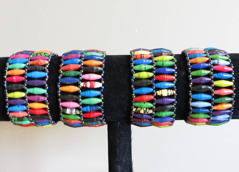 This fun to wear bracelet has 9 to 11 beautiful Project Lydia beads on an elastic strand. Wear one alone or wear three or four together. Each bead is made from recycled paper which is cut into long strips and individually hand rolled. The colors you see are the colors that are in the paper. The process of creating a piece of beaded jewelry from hand-rolling the bead to assembly, takes about a week.
