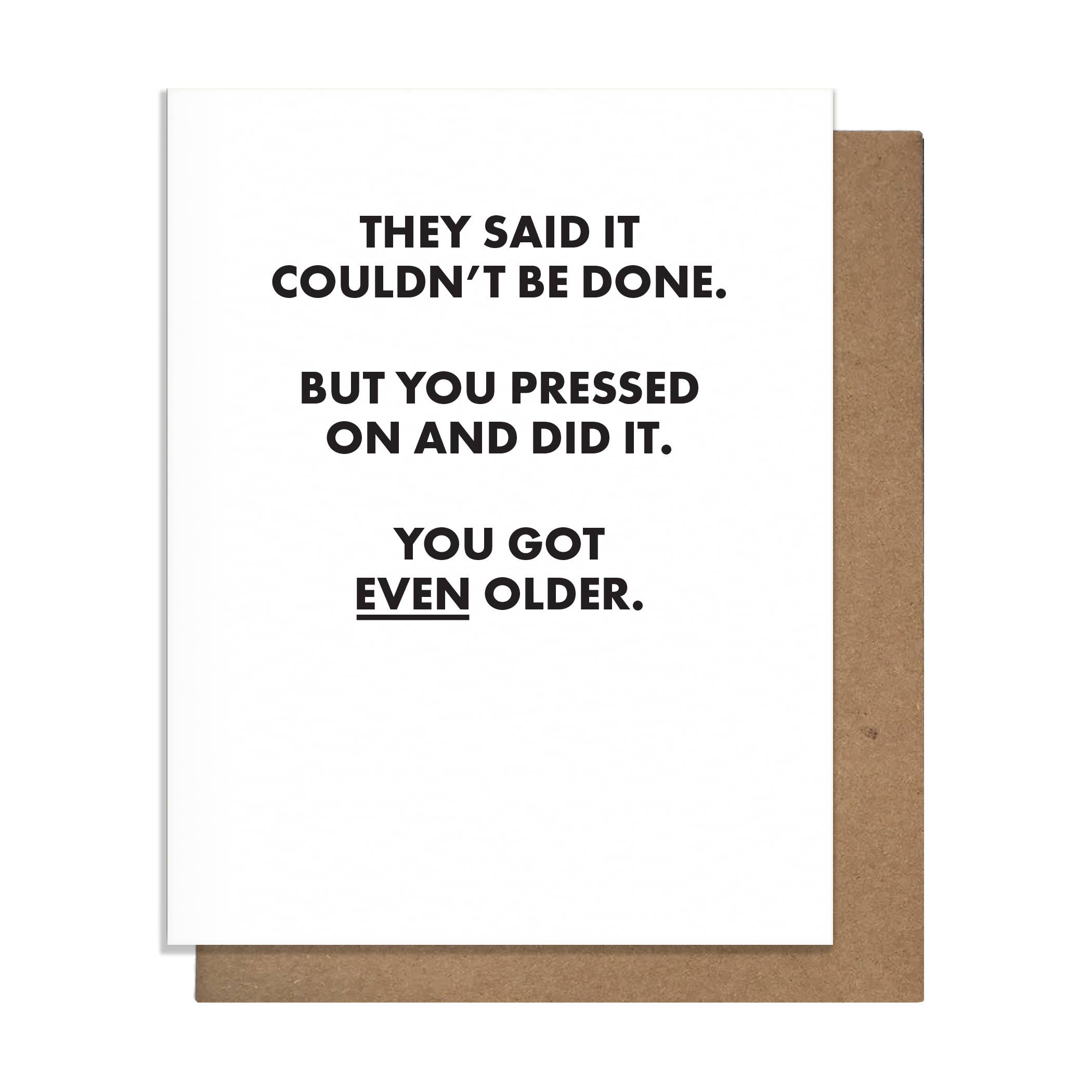 “It’s all fun and games until your metabolism slows down. Happy Birthday.” DETAILS // • Size: 5.5 x 4.25 • Inside Message: blank • Paper: white cotton • Envelope: brown bag • Printing: letterpress • Ink: black