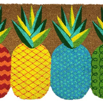 Welcome guests with a touch of tropical flair using our Pineapple Welcome Doormat. Featuring a vibrant pineapple design, this doormat adds a cheerful and inviting atmosphere to your entryway. Made of natural coir, a dense fiber that is naturally mold and mildew resistant. Coir is a renewable resource that is durable and coarse, excellent for scraping shoes clean. Vinyl backed for increased durability and to help prevent movement, coir doormats are weather tolerant absorb moisture and retain their shape. For best results keep in a sheltered area such as a covered porch, keeping extreme moisture and sunlight to a minimum. Vacuum, sweep or lightly hose clean. 70% coir, 30% vinyl.