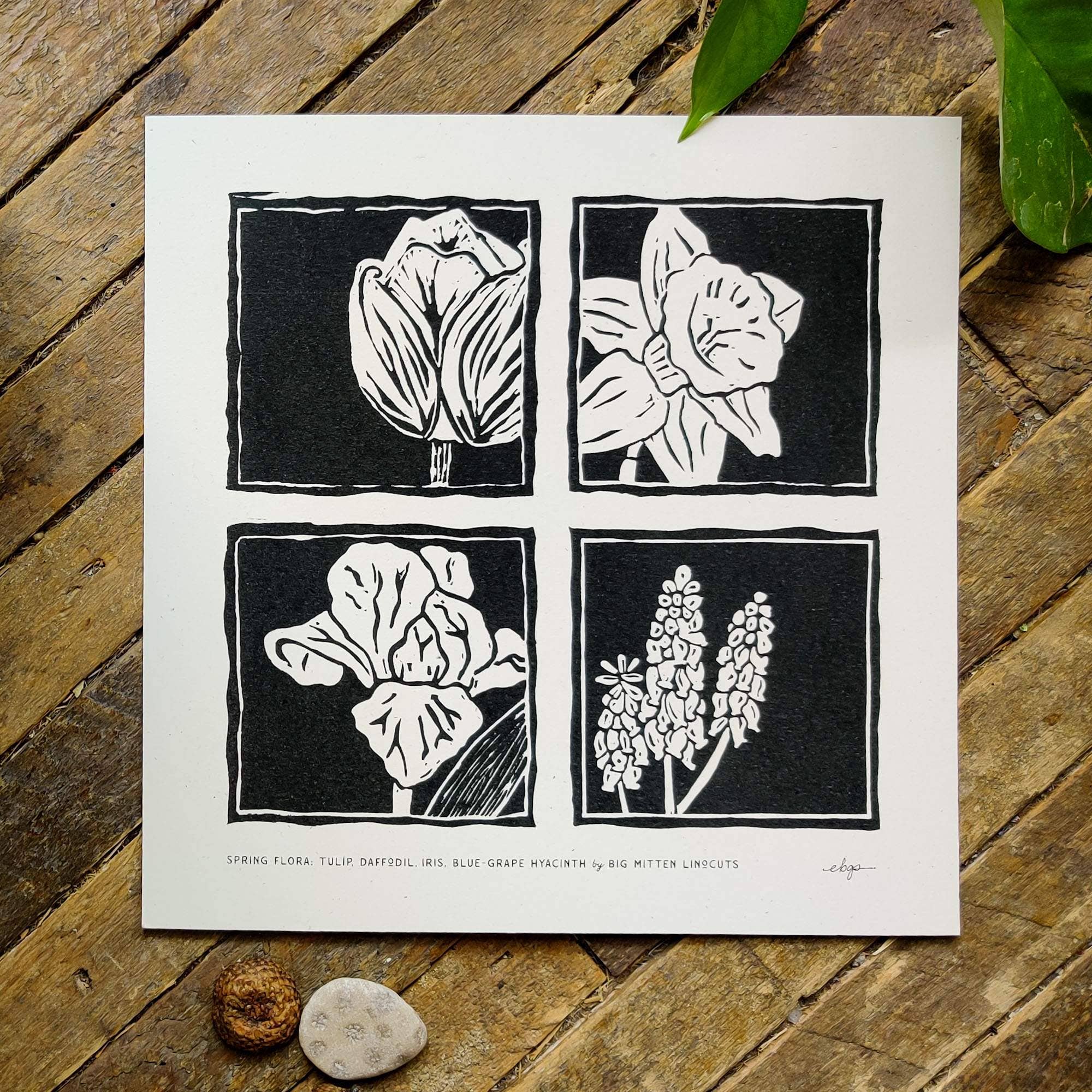 Linocut print of original art by Big Mitten Linocuts printmaker Betsy Stecker. This high-quality reproduction is printed on recycled, heavyweight 100-lb cardstock with natural fibers pressed throughout the paper. Entirely made by Michigan small businesses: the printmaker, hydro-powered paper manufacturer, and mom-and-pop printer are all from the mitten state. Print comes cello-wrapped with recycled chipboard backing for support. Standard frame size! Frame to 8x8, 8x10, or 10x8 depending on print. (Frame not included.)