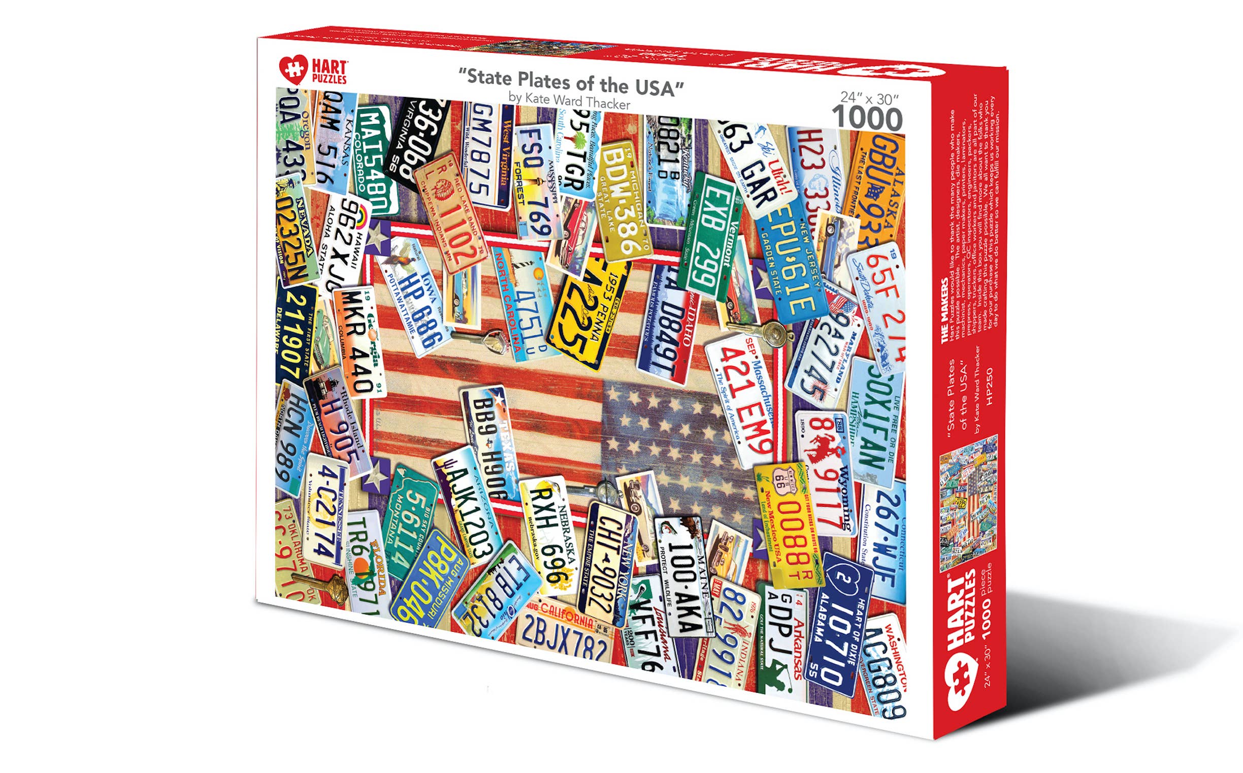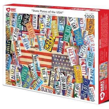License plates or tags are a sign affixed to a vehicle displaying a series of letters or numbers indicating that the vehicle has been registered within the particular state of their registration. States designed them with the idea of promoting their state. Look for your state's plate in this 24”x 30” 1000 piece puzzle. By Kate Ward Thacker Best shipping cost with Mix & Match Designs in Case lots of 24 units