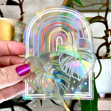 Prismatic rainbow decal with original artwork. Place inside your sunniest room to create happy rainbows! This decal measures 4"x4" and can be repositioned and removed leaving no residue. Decal comes packaged in compostable plastic, with paper insert description of what it is and how to use it.