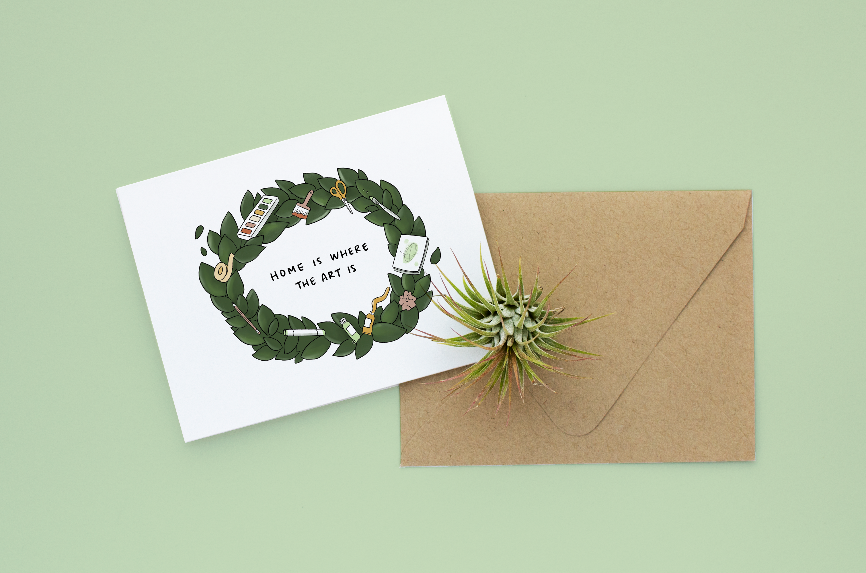 Greeting Card. Size: A2. Interior: Blank. Paper: 80 lb natural cardstock. Envelope: Kraft brown.