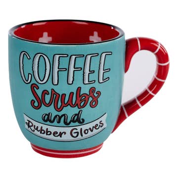 Thank a nurse for her excellent care when you wrap the Coffee Scrubs Rubber Gloves Ceramic Coffee Mug as a thank-you gift. Light blue exterior with royal blue interior, White and royal blue lettering, Coffee, scrubs, and rubber gloves, Blue sentiment on back, Thank you, Ceramic mug, Packaged in a tuck-top Kraft cardboard box, Not microwave-safe, Handwash recommended, Capacity: 14 fl. oz. (325ml), Packaging dimensions: 5" x 4.9" x 3.6" (127 x 124 x 91mm)