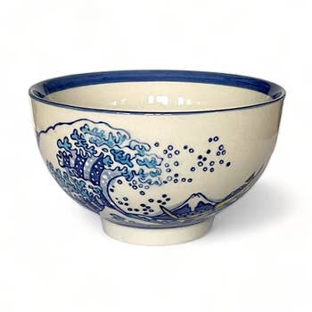 The Great Wave off Kanagawa is one of the most famous woodblock print image by Japanese ukiyo-e artist, Hokusai. 5" x 2.75"h Ceramic. Made in Japan.