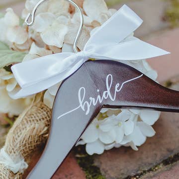 Your wedding dress is an important part of your special day! Why not hang it on a beautiful hanger! This hanger says "Bride" in gold wire with a heart on both sides, and a white bow at the top. These are perfect for wedding dress photos and they make a wonderful wedding keepsake. ~~~The Details~~~ * Handmade in the USA! * Smooth glitter gold finish with a removable bow. * Each hanger is solid wood, 17 inches in length and has notches for dress straps.