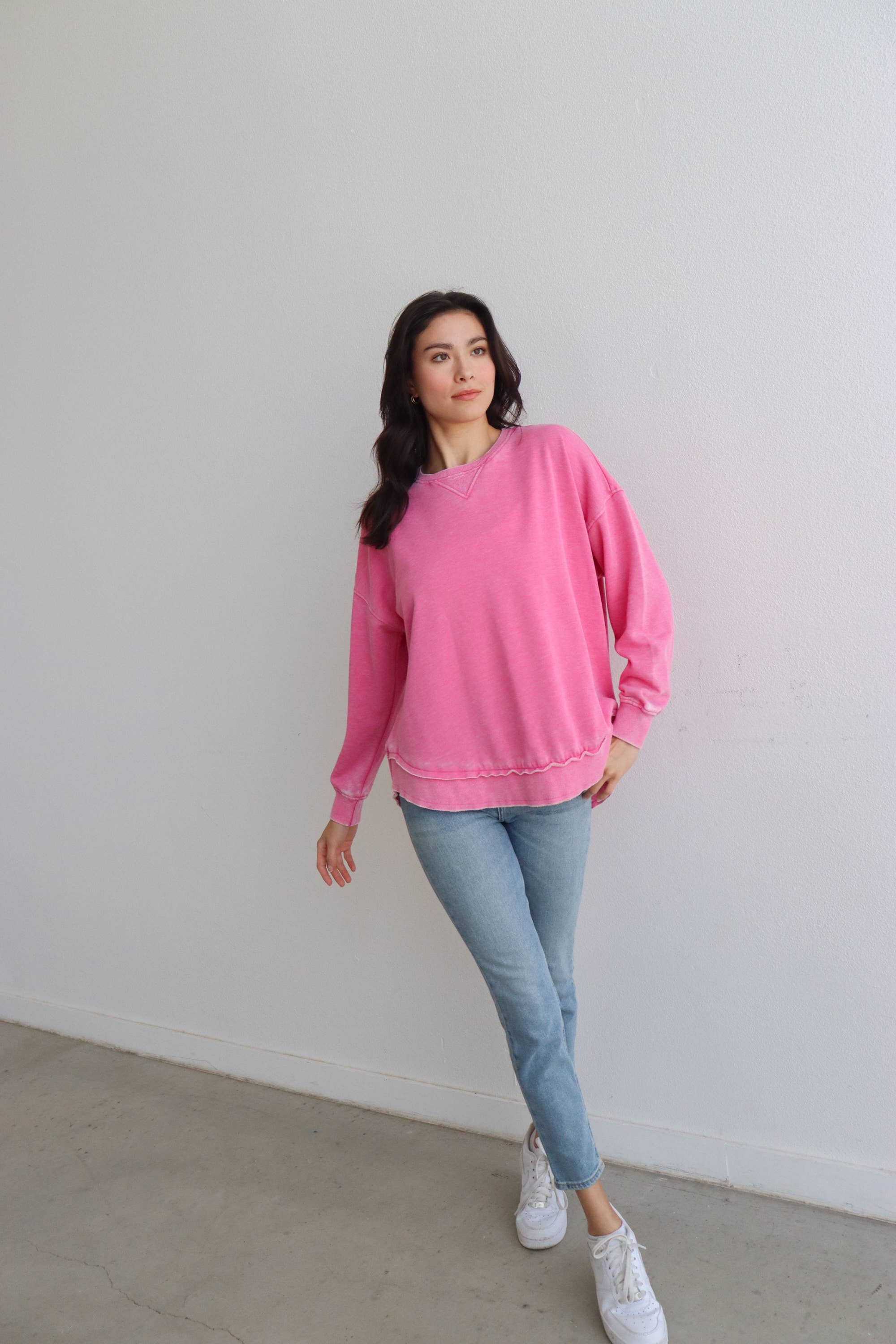 Buttery soft to the touch finished with a burnout wash treatment that gives it a lived-in look. Pairs perfectly with 451 Campus Sweatpants. Features: - crew neck with dropped shoulders - relaxed hi-lo curved bottom hemline - rib at neckline, cuffs, and hem Fit: Oversized 60% cotton, 40% polyester. Burnout Fleece. 270 GSM