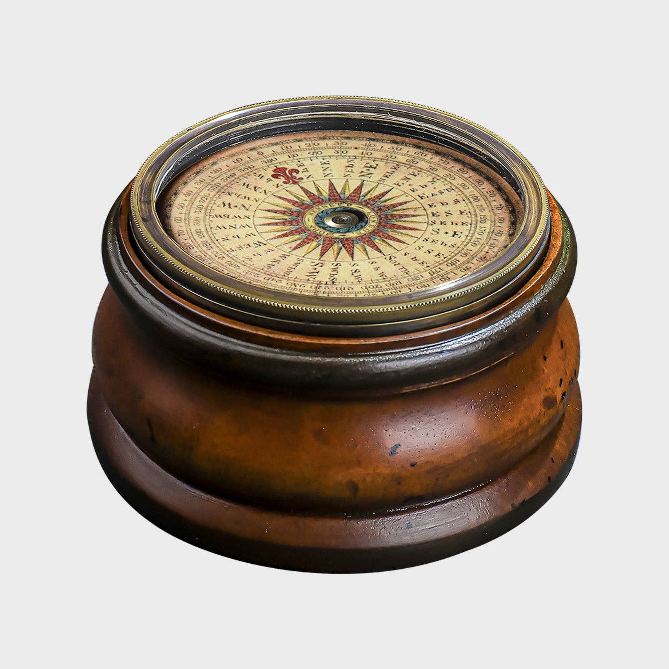 Our Nautical / Expedition pocket compass. Beautiful compass card, its magnets pointing North, so you are always sure find home. It’s that simple! This compass in three varieties, brass case compass (with lid), charming hand turned wood box, mahogany desk pedestal. Length : 3.25”, 8.5 cm Width : 3.25”, 8.5 cm Height : 2.5”, 6.5 cm