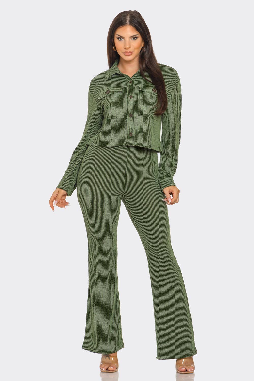 Solid color body suit with flare causal pants set. Slinky dressy fabric. Short sleeve body suit with snap button. Matching casual flare pants is elastic waist band with draw string. Center trim line. Loose fit. Flare bottom. 95% poly 5% spandex. Import. Inside pack comes S/M/L (2:2:2) 6pcs/pack.
