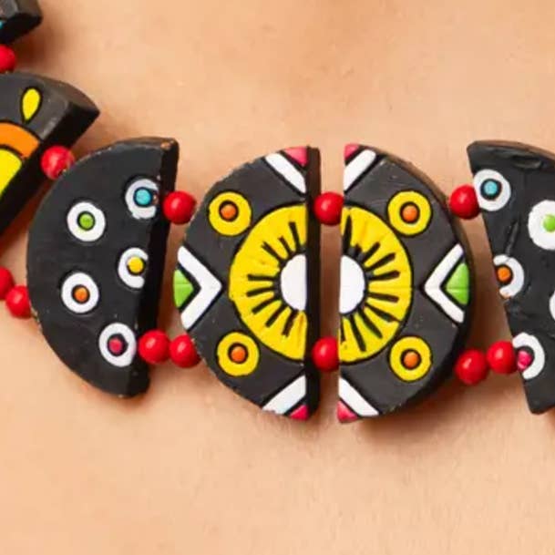 Made in India Color: Black, Blue, Multi-Colored, Red, White, and Yellow Material: Clay Style: Artistic and Bohemian Theme: Geometric Product Language: English Weight: 250 g (8.82 oz) Dimensions: 53.3 x 12.7 x 0.5 cm (21 x 5 x 0.2 in) Product Materials: Organic Packaging: Recyclable and Reduced Production: Ethically sourced, Fair trade, and Low-impact transport