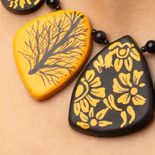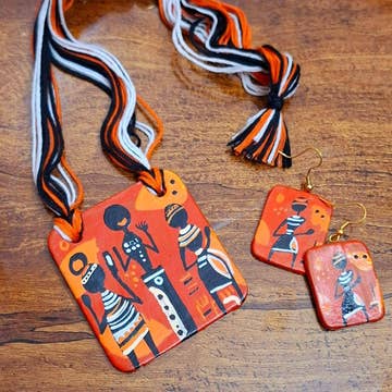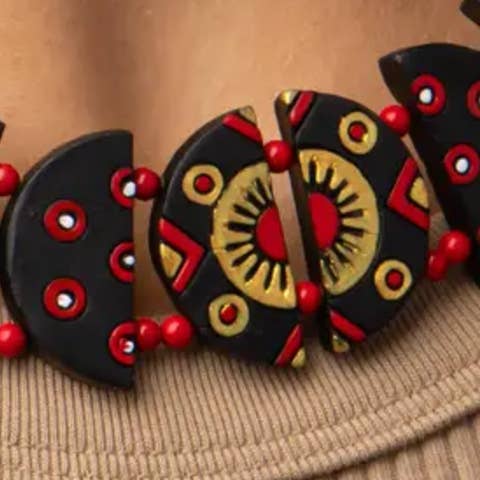 This 'Geometric Necklace' is a handmade set containing a necklace & a pair of earrings. Our jewelry is rooted in love and tradition. It comprises easy-to-clean necklaces & earrings that are: *Handcrafted *Durable *Light-weight *Hypoallergenic *Statement jewelry *Made from earthen clay Doing better for planet & people: *Organic *Sustainable materials *Empowering communities At House of Kraft, we blend traditional Indian craftsmanship with a modern twist across fabric, leather & other unique materials. We offer everything from handcrafted accessories to custom-designed home & lifestyle products. Our clay jewelry enhances your wardrobe while honoring the environment. These pieces make the perfect gift for her for any occasion. We work with artisans & Indian communities to transform each design into a masterpiece while keeping our rich heritage. People also search: Clay Earrings, Handmade,Clay Necklace valentine gifts, valentine, easter, valentine's, valentines day