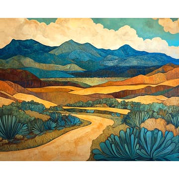 Meanwhile, on the Range by Bria Hammock features a cowboy hat on a fence post against a glowing sunset sky. Bold color and expressive brushstrokes give this western scene a fresh, modern feel. Each print is packaged in a protective sleeve with chipboard backing, ready to display. Made in the USA. Weight: 1 oz (28.35 g).