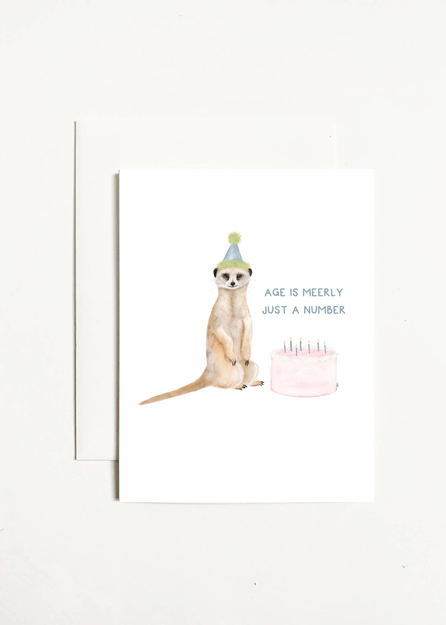Just some cute watercolor illustrated meerkats popping out from behind some presents, ready to celebrate a birthday or any special occasion! A2 card with an original watercolor illustration printed on 130 lb paper. Comes with an orange deep-flap paper envelope in a protective cellophane sleeve. Size: A2 (4.25" x 5.5")