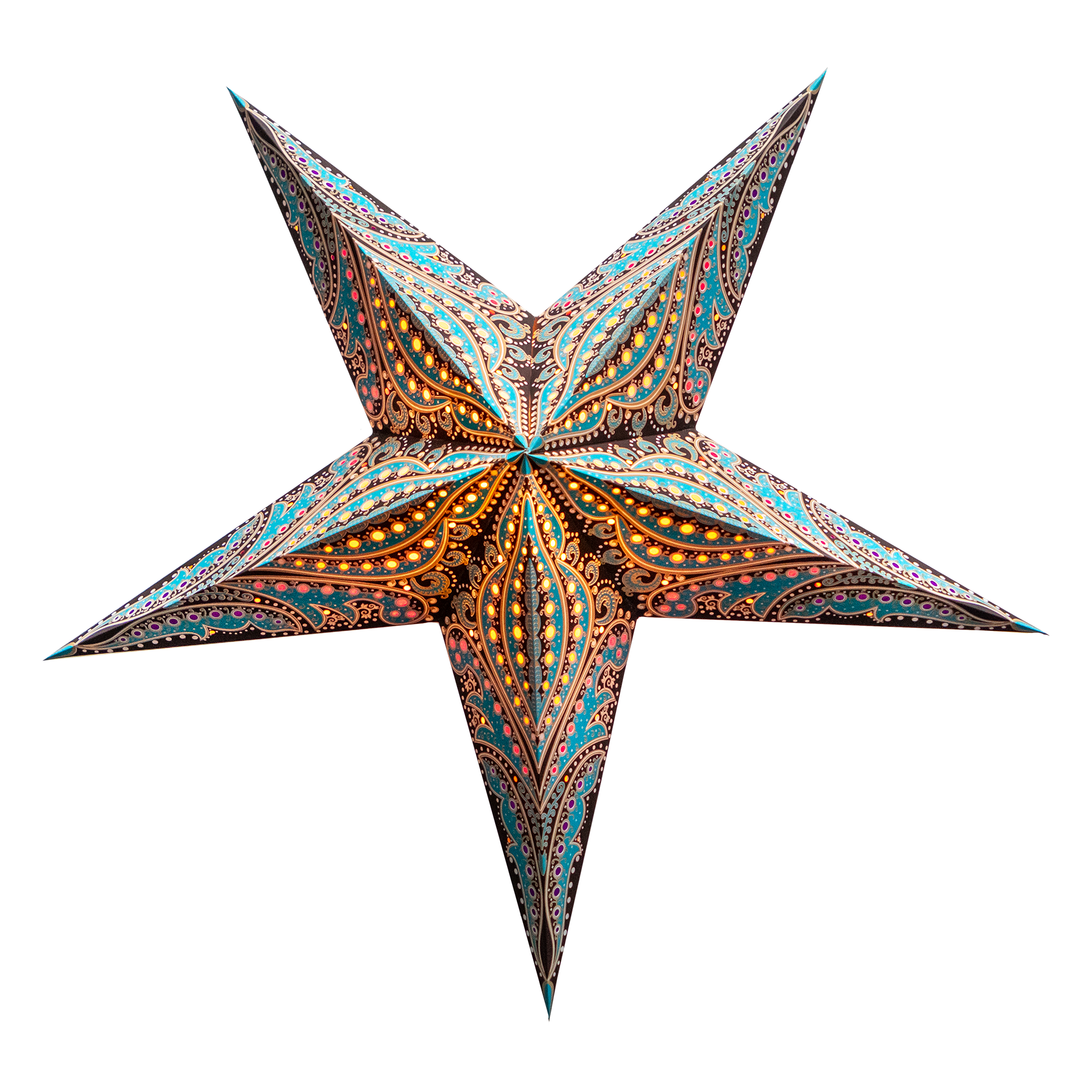 Our cool blue star lantern with its delicate teardrop-shaped design motif creates a relaxing blue glow for a chilled-out ambience anywhere! Beads of light in turquoise and yellow glow against a delicately etched background of electric blue. Tissue paper inserts soften the light – perfect for chillout spaces, colourful gatherings, and cosy corners! * Perfect for: ambient, decorative/mood lighting, party décor, night light, lampshade * Creates a cooling glow * Base Colour: Electric Blue * Number of tips: 5 * Diameter: 60cm
