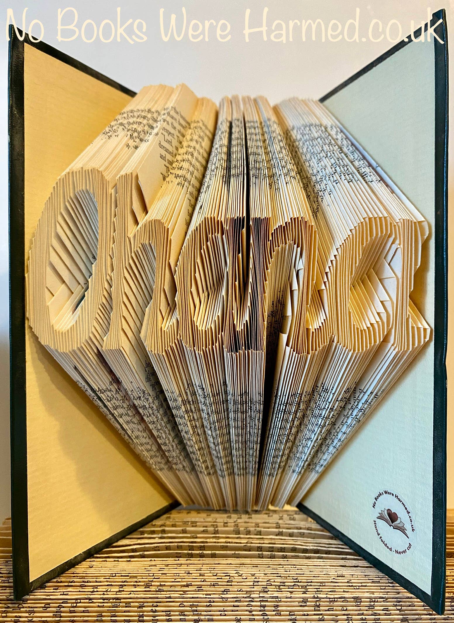â Hand folded â Never cut â Designer made â Book art Photos shown are of past pieces, most of which have gone to their new forever homes. I create this art in my home studio in the north of Scotland, carefully hand folding the pages of reclaimed pre-owned & vintage books. Each sculpture is unique and exact colours and final appearances naturally vary from book to book. ⢠If you can say it with flowers, they'll remember it with a book â˘