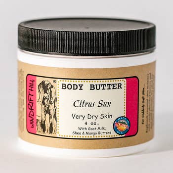 Sweet and refreshing Sweet Orange, Coconut Extract, Beeswax, Coconut Oil, Botanicals and Vitamin E combine with Shea, Avocado and Cocoa butters to gently pamper the skin. Creamy and rich, but never greasy this all-natural body butter is light but instantly absorbed to restore and soften skin. Product Size: 4 oz.