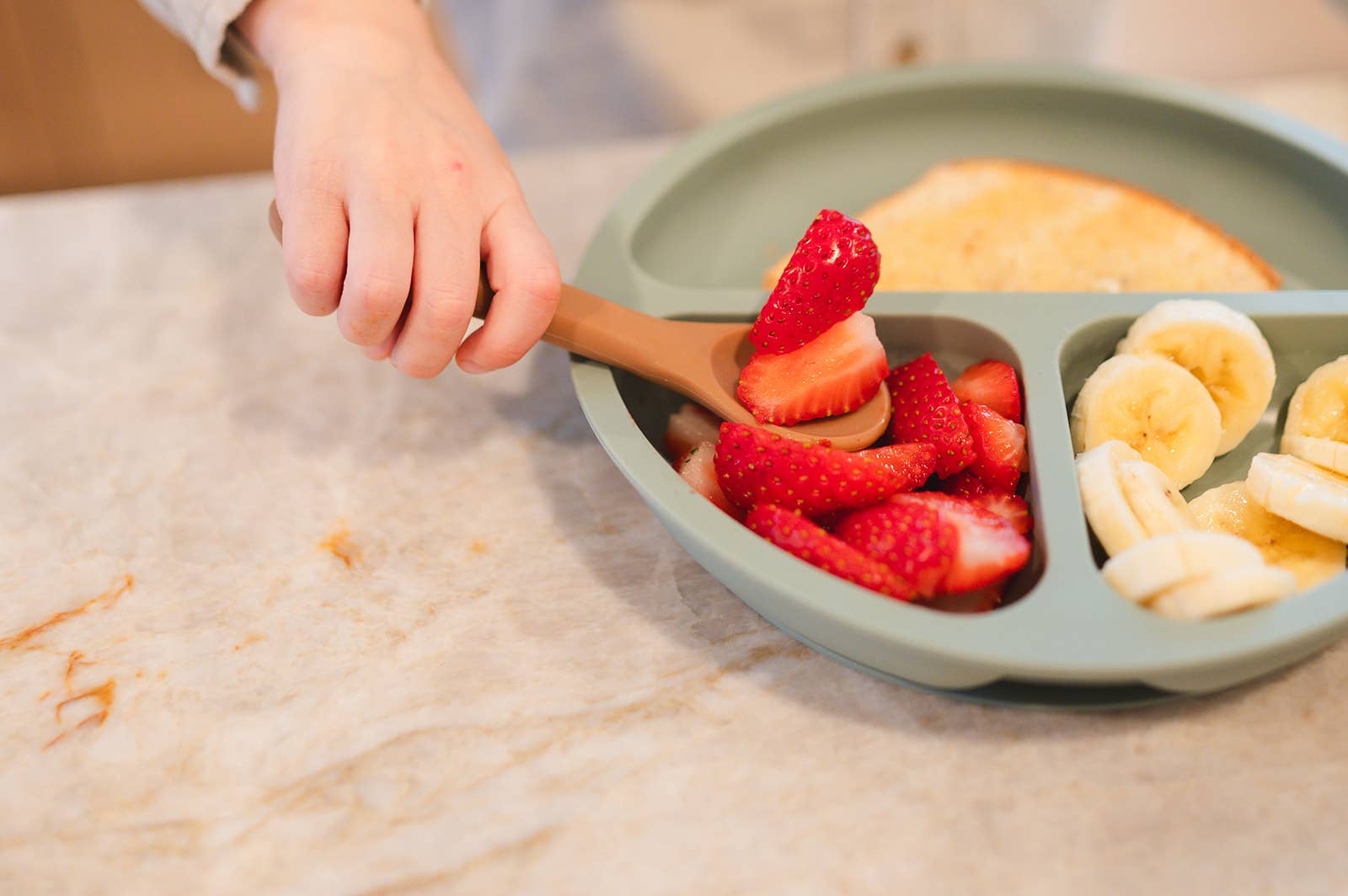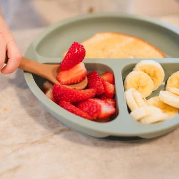 The dino plate is designed to fit and work together with the dino utensils. Dinosaur footprints divide each section with specific locations for the fork, spoon, and pusher to park when not being used to eat with. Made and packaged in USA. Microwave and dishwasher safe. Food safety tested materials, CPSIA compliant; BPA, Phthalate, PVC, lead and paint free.