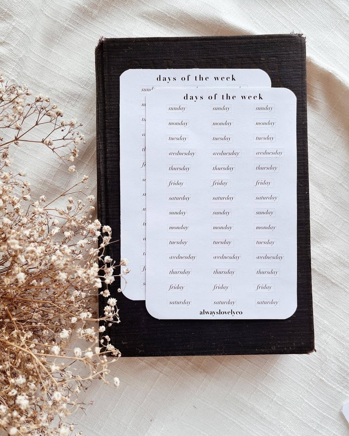 Original illustration stickers by The Well-Appointed Desk. Vintage typewriter fonts on clear matte sticker paper makes it easy to add the day of the week to your planner, journal, notebook or calendar. Each sheet include six (6) full weeks and two (2) months worth of moon phases. Perfect for journals, planners, memory keeping and more. 16 rainbow stickers per sheet. Details: • Clear matte weatherproof paper stickers on backing sheet • Ink is water resistant but stickers are not dishwasher/outdoor waterproof • Size: approx. 3.5 x 6.5 inches • No AI. All assets collected by The Well-Appointed Desk. Individually packaged in cello sleeve.