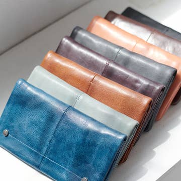 Boutique-Ready Genuine Leather Style Genuine leather wallet designed for gift shops and boutique sell-through—compact, premium, and easy to stock. Key features: RFID Protection, Complimentary Gift. Color: Black. Size: 7.4 x 1.5 x 4 in. Perfect for: • Gift shops & boutiques • Lifestyle stores • Checkout add-ons Why it sells: • Fast-moving gift category • Low footprint, high margin • Easy to bundle with bags Merchandising placement: • Near checkout / impulse area • Gift wall / men’s and women's accessories • Countertop display tray Pairs well with: • Crossbody purses • Matching wallet colors" The Kima Wallet stands out with its refined design and intelligent functionality, crafted from premium genuine leather for a luxurious finish. The front features a sleek strap with a button closure, opening to a thoughtfully arranged interior. The left panel offers eight card slots, while a unique middle flap—designed like a turning page—adds an elegant touch and expanded organization. On one side of the flap, you’ll find an ID window and a secure zip pocket; on the other, six additional card slots and another ID window. The right panel includes a dedicated phone pouch that holds your device neatly in place, complemented by a small storage pocket behind it, accented in a contrasting tone for a stylish pop of detail. Blending sophistication with smart design, the Kima Wallet is a statement piece made for those who value both beauty and utility. Premium handcrafted leather wallet offering everyday functionality, clean design, and strong gift appeal for boutique retail."