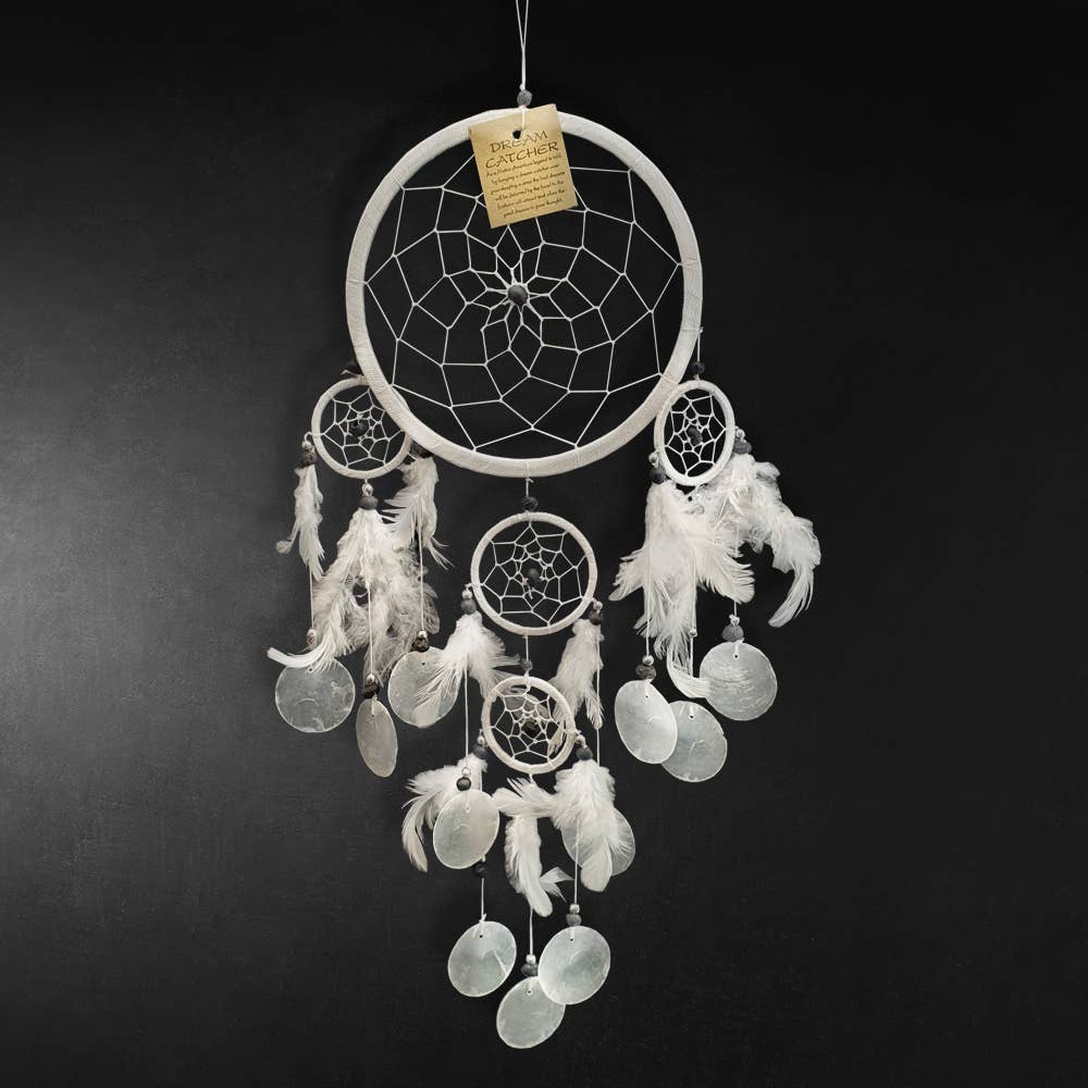 Layered Dream Catcher with 9cm main ring and four smaller rings, bead details and feathers. Ethically handcrafted. WONDERFUL TRADITION - Symbolize the yearning for a better life. Is intended to protect the sleeping individual from negative dreams. GOOD DREAMS - Let you sleep with sweet dreams every night. It brings love, light and positive energy. HANDMADE ORNAMENT - Every item handmade in ethical condition and harmony with nature, weaved with the traditional manual techniques. BEAUTIFUL ART - For the home, office, you can even use it as a wedding and party decoration. GREAT GIFT CHOICE - It represents a blessing, pray for peace and good luck. An ideal gift for someone undergoing a nightmare and sufferings.
