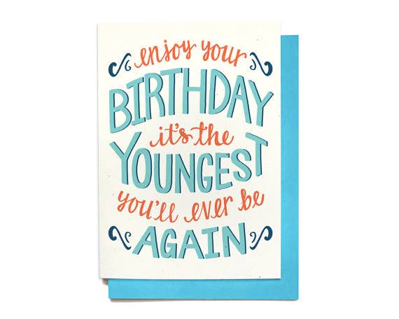 FRONT: Happy 29! (...again) INSIDE: blank DETAILS: • Dimensions - one 5x7 folded card • Paper - 100# natural cardstock, 100% recycled • Envelope - aqua recycled envelope (A7) • Packaging - sealed in a clear sleeve • Shipping - USPS First-class with tracking