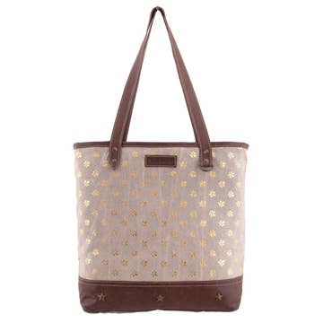 Our recycled-canvas tote bag is fully lined, has an interior pocket, is adorned with appliques and vintage print patches, and has durable leather handles and trim. NOTE: Due to the recycled nature of the fabric, canvas may show signs of worn-like imperfections that add to its character. There will be variations in color. 17" W x 16" H x 4" D / Handle Drop 11.5" L.