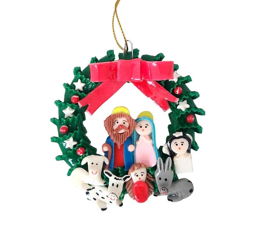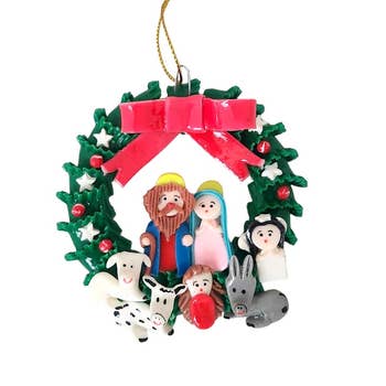 The hand molded and hand painted potato dough nativity scene on the inside of these carved gourd ornaments has made them a favorite all year long! Specifics: 3-3.5" Each piece is unique. Size, shape, and color vary. Assorted designs.
