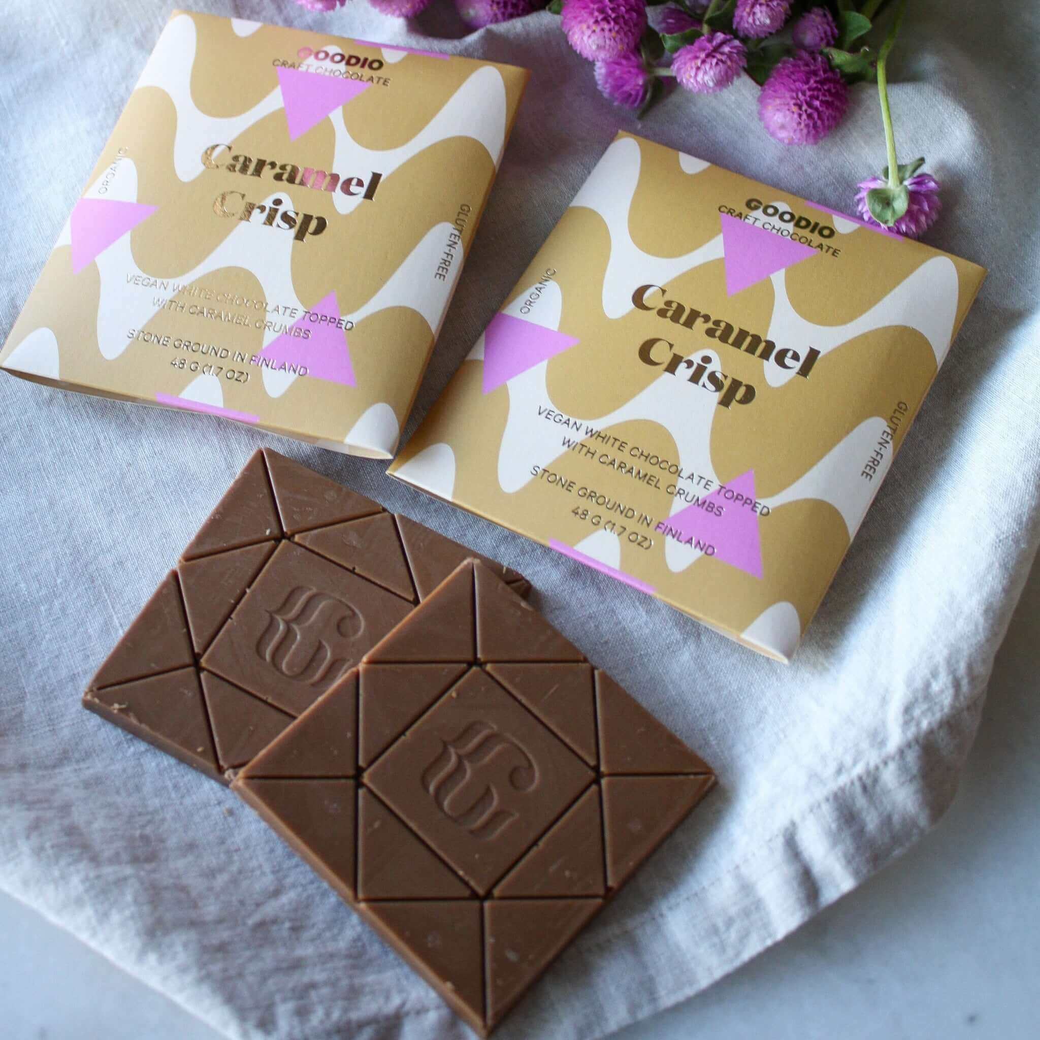 Our vegan white chocolate is even more perfect with the crispy caramel crunch on top. Too good to be true! This product is 100% vegan & organic. INGREDIENTS: Coconut palm sugar*, gluten-free oat* 25%, cacao butter*, coconut flakes*. (*Organic) Store in a cool, dry place. Dairy-free, gluten-free and soy-free. May contain nuts: cashews. Net weight: 48g This bar is proudly handmade with love in Finland - the happiest country in the world by Goodio Chocolate Artists.