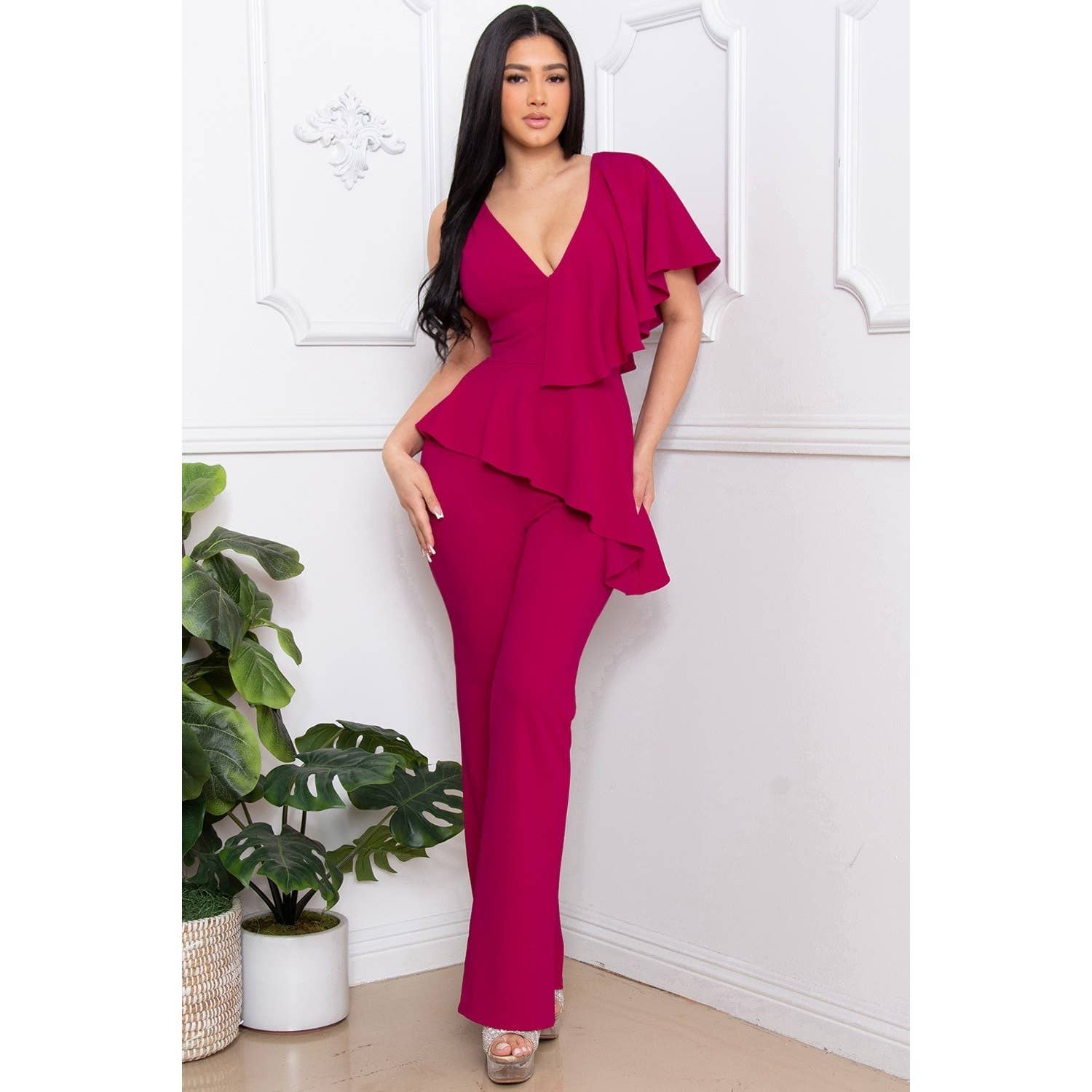 - Style No. : J2236SP FAUX FUR COLLAR AND WRIST JUMPSUIT LONG SLEEVE DEEP V-NECK ZIPPER BACK BELL BOTTOM MODERATE STRETCH MODEL: 5'8 SMALL SELF:95% POLYESTER 5% SPANDEX LINING:100% POLYESTER