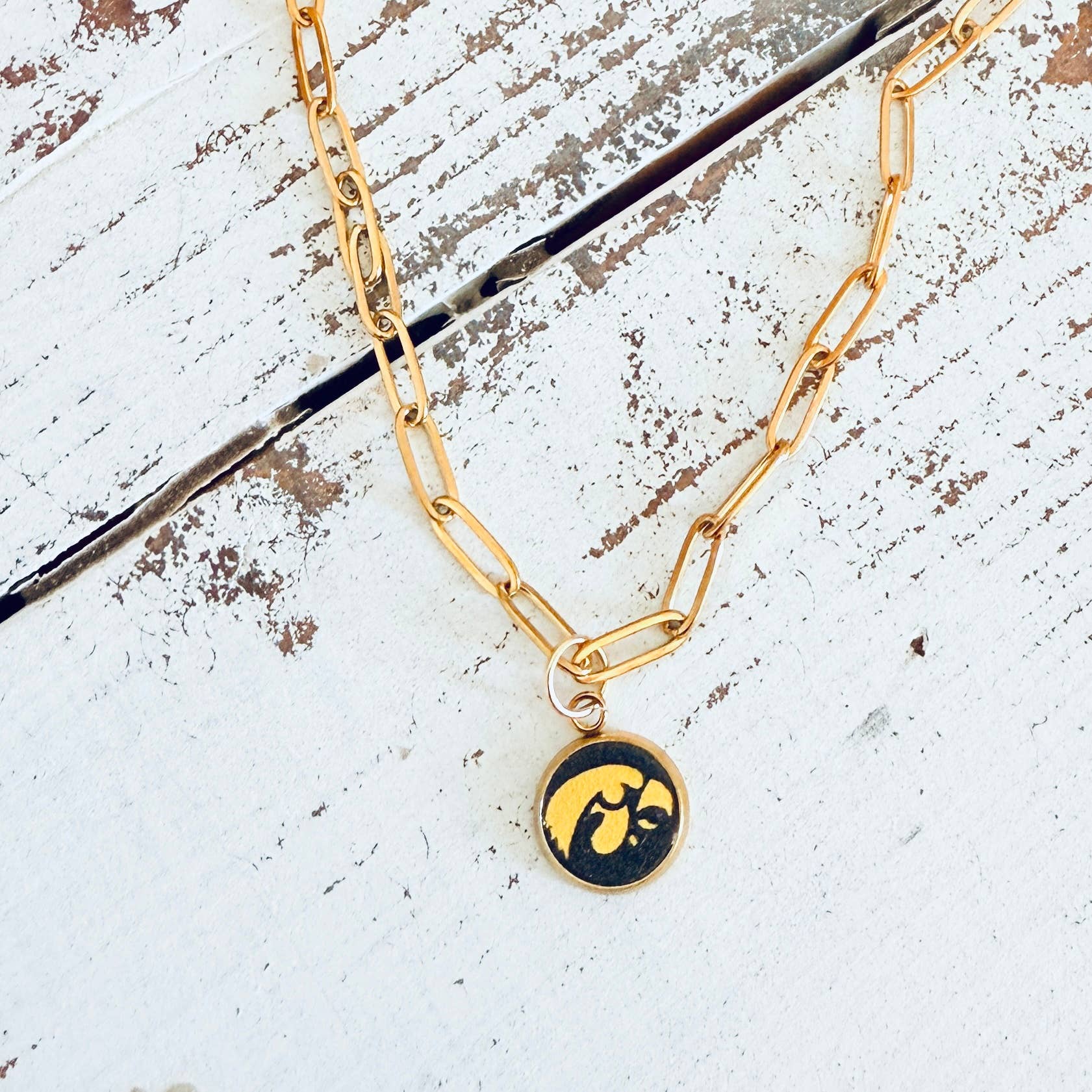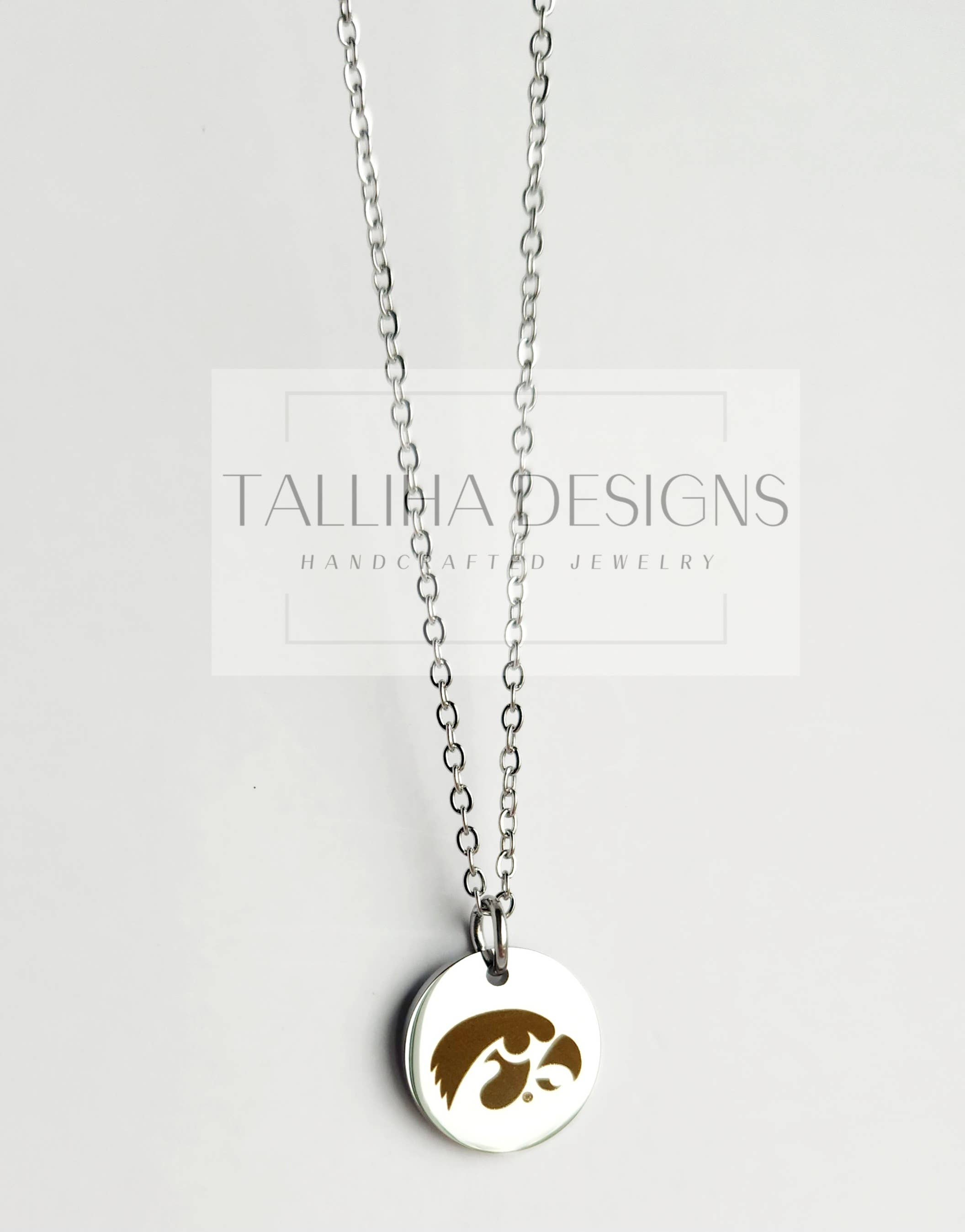 et of three silver plated 16” necklaces (each with a claw clasp and 3” extender). Each necklace features a different chain style and charm, to include gold and black beads, a yellow and black enamel Iowa logo charm, and a silver plated stamped disc featuring the “Go Hawks” slogan. This is an officially licensed product.