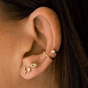 No piercing no problem! Just slip on and go. The perfect earring to give you some edge. • Available in Gold Vermeil, Rosegold Vermeil, Sterling Silver • Cubic zirconias • 12mm size • 5mm opening. Worn at the middle part of ear lobe