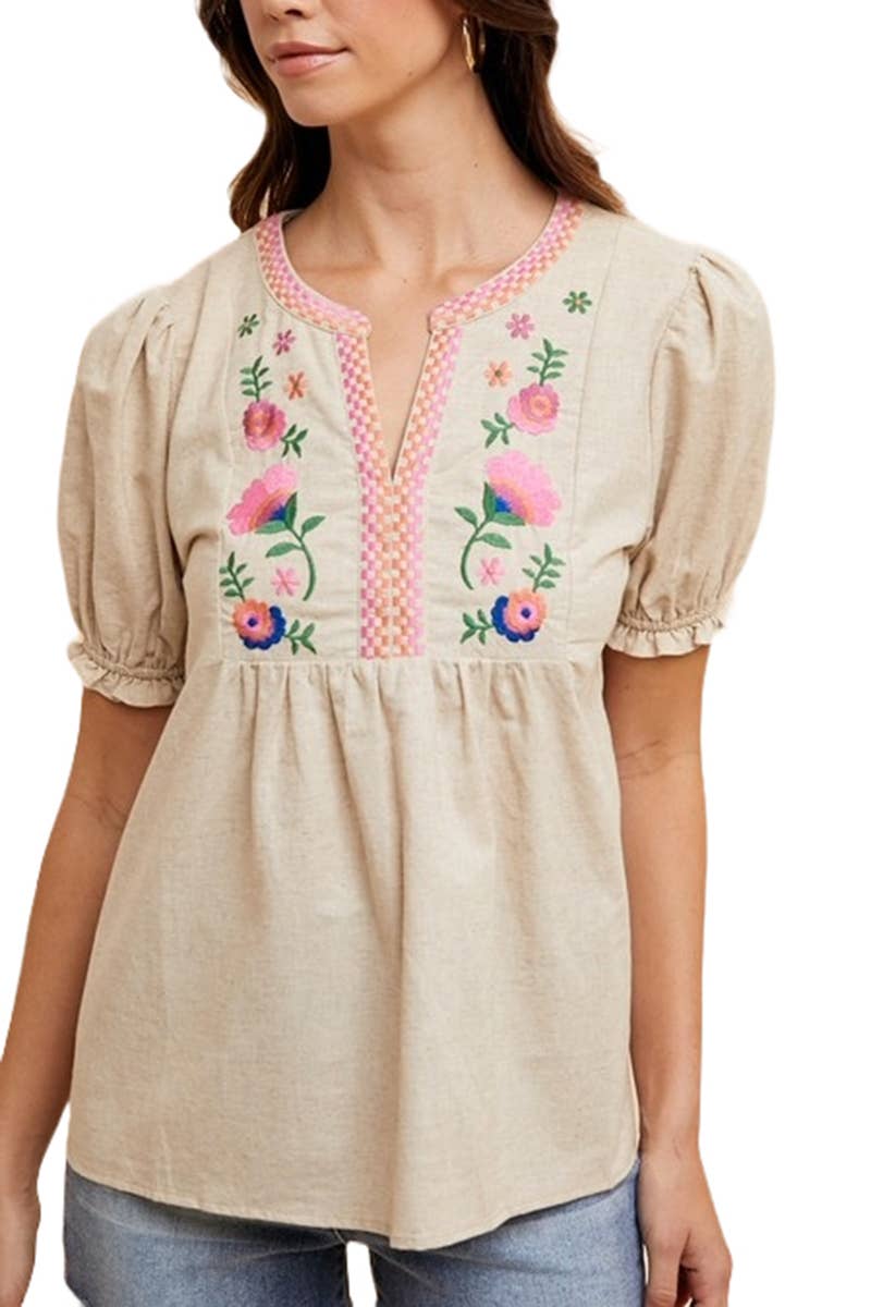 Raj Lola Top is embellished in jewel tone floral embroidery and puff short sleeve. Lola is made with 100% Cotton.