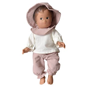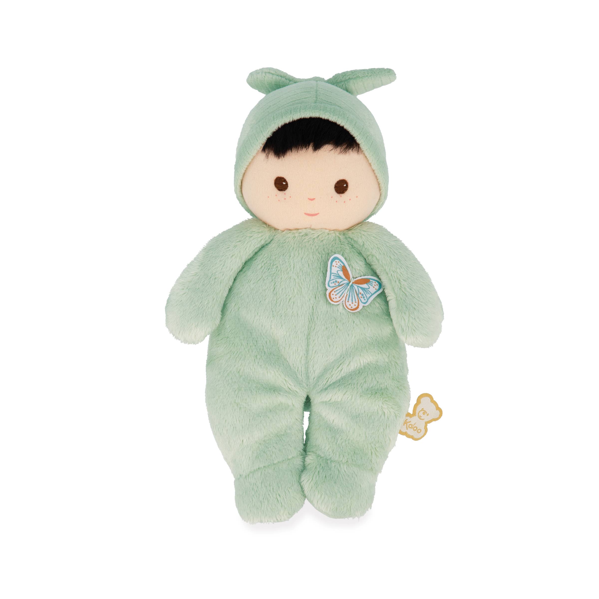 Olivia is the fabric doll that invites you to go for a walk in nature. She measures 12.5 inches and is suitable for babies from birth. She loves the great outdoors and is dressed in pretty olive green dungarees embroidered with a pretty dragonfly. Olivia wears pretty shoes for a walk in the fields, and protects her hair from the wind with an elegant headband. Olivia celebrates values such as nature, freedom and authenticity. Around her neck is a pretty ribbon on which you can write baby's name. The size of this baby doll makes it ideal for cuddling, and little hands can easily grab it by the arms or legs. The Olivia doll is made from polyester and cotton. It is Machine wash hot and comes in a beautiful gift box, for a tender baby gift.