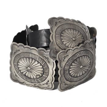 Upgrade your chain belt game, this chain belt brings a one-of-a-kind faux leather grommet disc design. Discover the magic of accessorizing with this versatile chain belt, effortlessly upgrading the style quotient of any outfit. Available in BG, BR, BS, BZG, BZS, G, S, W. This item is sold in packs of 1. Concho Engraved Buckle This chain belt approximately measures: Length: 44.5 Inches Width: 3.5 Inches This chain belt is made with Pu+Alloy.