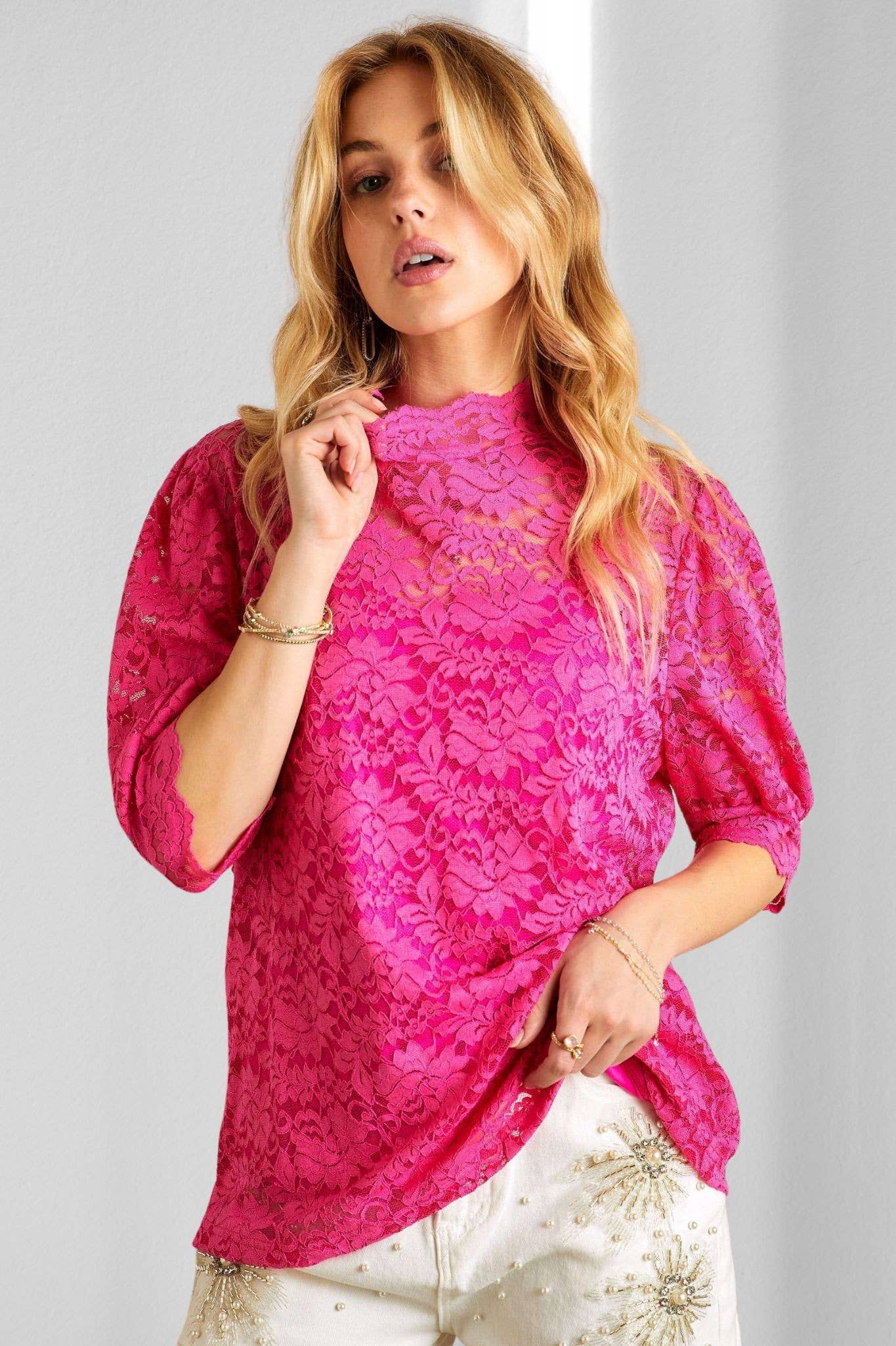 This sheer top features two front pockets, 3/4 sleeves, and a double-layer peplum detail. Also, it has a crew neckline and bronze accent buttons. A perfect pair with the Amore Peplum top. - The model is wearing a size 4/small - Materials: Fuchsia chiffon, gold buttons.