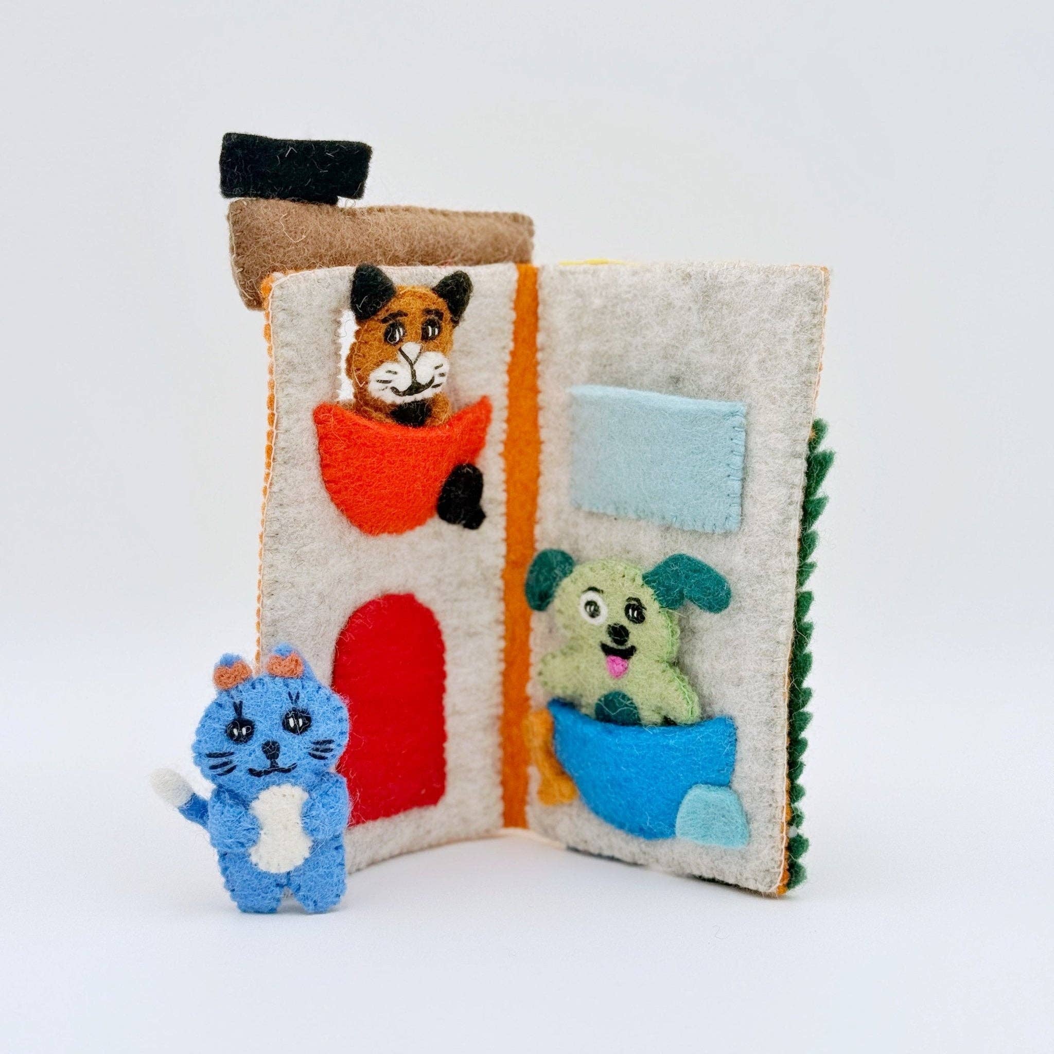 This adorable Noah's Ark Felt Puppet Bag is handcrafted by women artisans in Nepal. This playful children's tote features three removable, felt animal finger puppets - functional and playful. Felted Wool Azo-free dyes, eco-friendly and non-toxic 8" tall x 8" wide Strap hangs 6 1/2" Zippered closure Removable giraffe, elephant, lion felt finger puppets Suitable for children over 3 years old