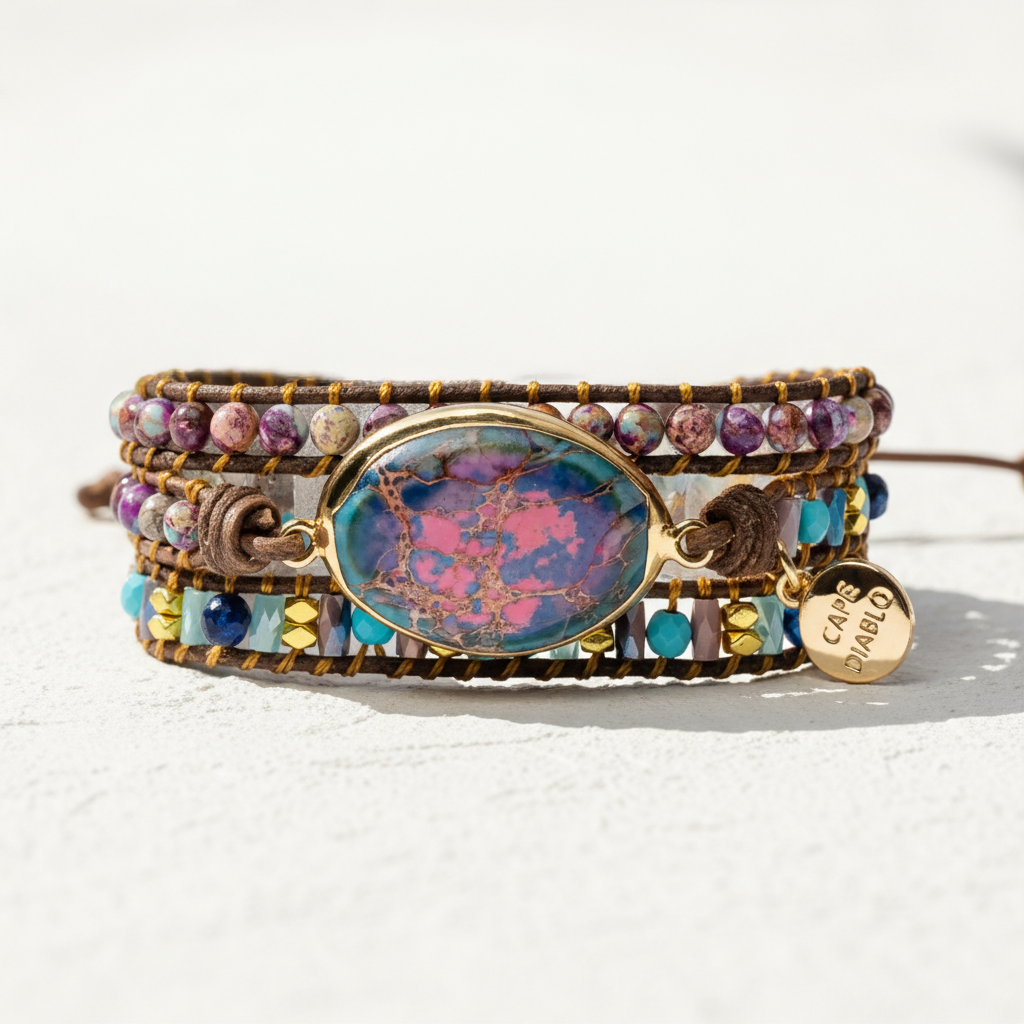 This beautiful beaded bracelet is handmade with dyed Jasper beads. It is vegan friendly. Materials: Imperial Jasper, Cord Metal: Stainless Steel Size: Around 6.5-8.5 inches + 3 closures for adjustment Handmade Artwork Made with Love and carefully manufactured Heart bracelet, Love bracelet, boho style jewelry, boho wrap bracelet, natural stone bracelet