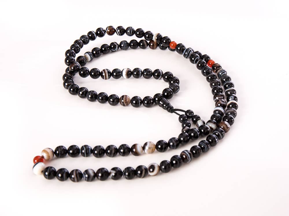 Malas are also called japamala, japa beads, juzu beads, or worry beads. It means garland in Sanskrit. In Catholicism, they are called rosary beads. Prayer beads are commonly used by Tibetan, Hindu, Chinese, Korean, and Japanese Buddhist monks, Zen priests, or nichirens. They normally have 108 beads plus dividers and guru bead. The number, 108, is considered a sacred number in Hinduism, Jainism, Tibetan Buddhism, and some Sikh traditions. It represents the 108 volumes containing the words of the Buddha. This set of mala is handmade with natural wood. The subtle natural wood smell, unglazed wooden surface, and beautiful grains give this set of Jape beads a Bohemian touch.