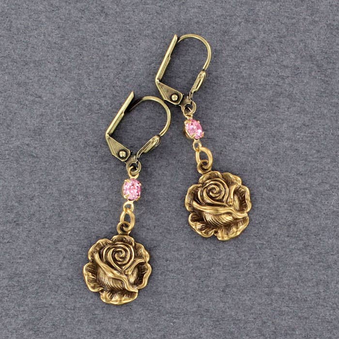 This earring features a stamped metal moon accented by a Austrian Crystal rhinestone. The earring is in an antique brass plated finish and is shown with a European wire. The earring hangs about 1.75 inches. If you do not see a color in the selection menu any color can be made by request!