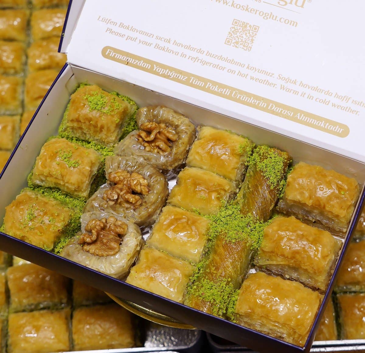 Karakoy Gulluoglu presents a wonderful mix of Turkish Assorted Baklava in a special, elegant box that makes for an unforgettable gift and experience. It's carefully produced with high quality materials, similar to other special baklava boxes from Karakoy Gulluoglu. What's included inside: Pistachio Baklava, Rare Stuffed Pistachio Roll Baklava, Pistachio Wrap Baklava, and a Palace Wrap Baklava with Walnuts. Ingredients: beet sugar, water, wheat flour, ghee, pistachio kernel, walnut, wheat starch, egg, table salt Shelf life and storage: Room Temperature - 2-4 weeks Refrigerated - 2-3 months How to enjoy: For the best experience, warm up your baklava in a conventional or toaster oven for 5-7 minutes at a temperature no greater than 300°F.